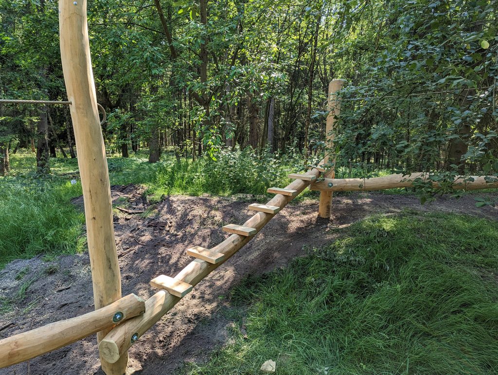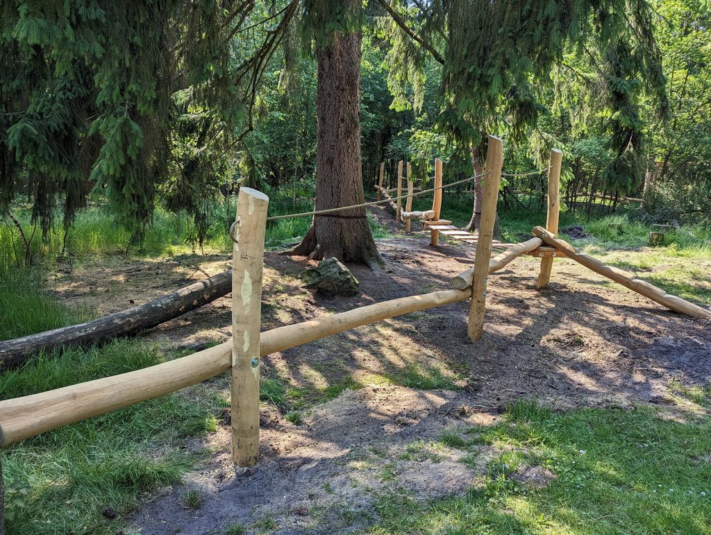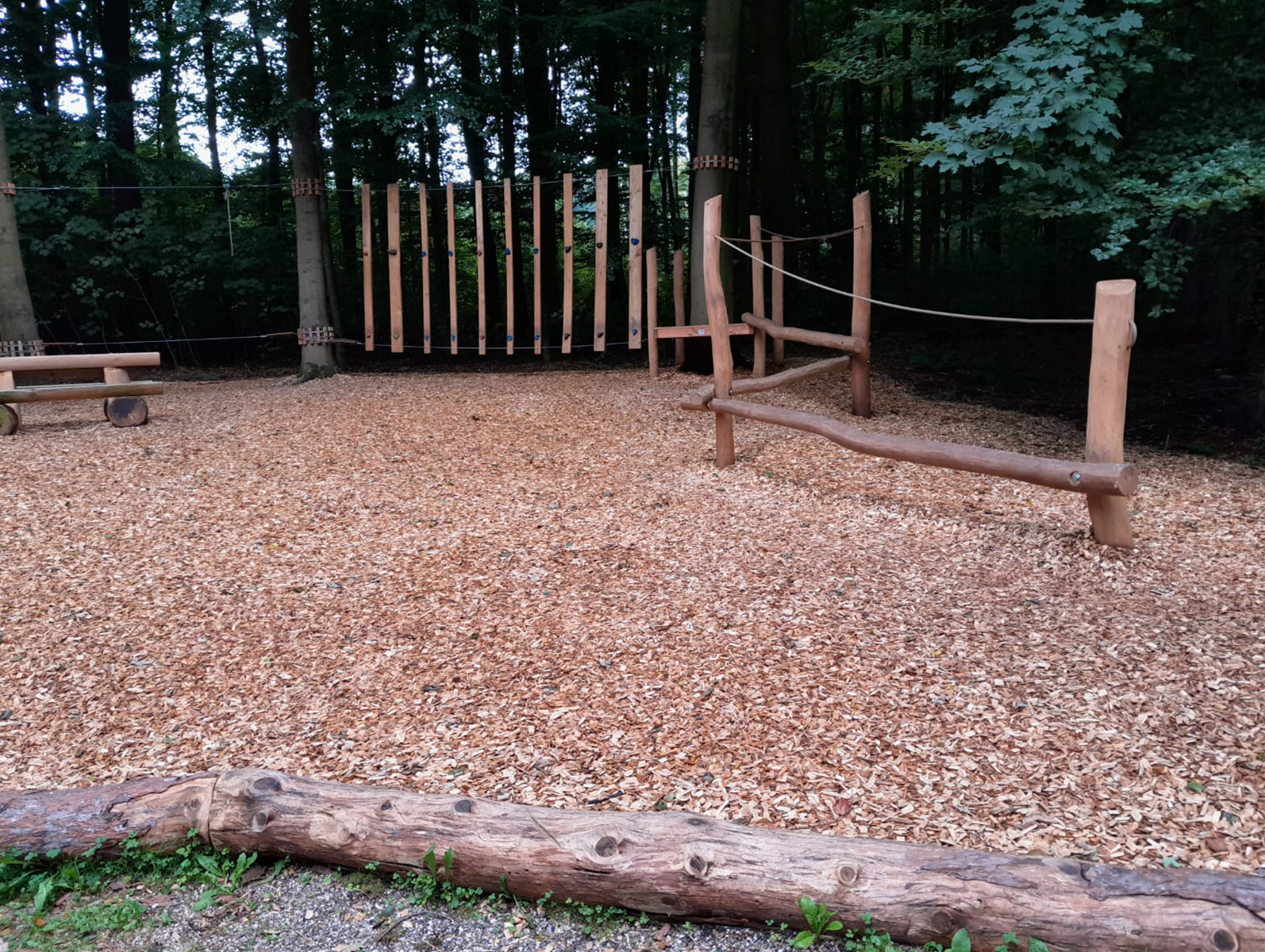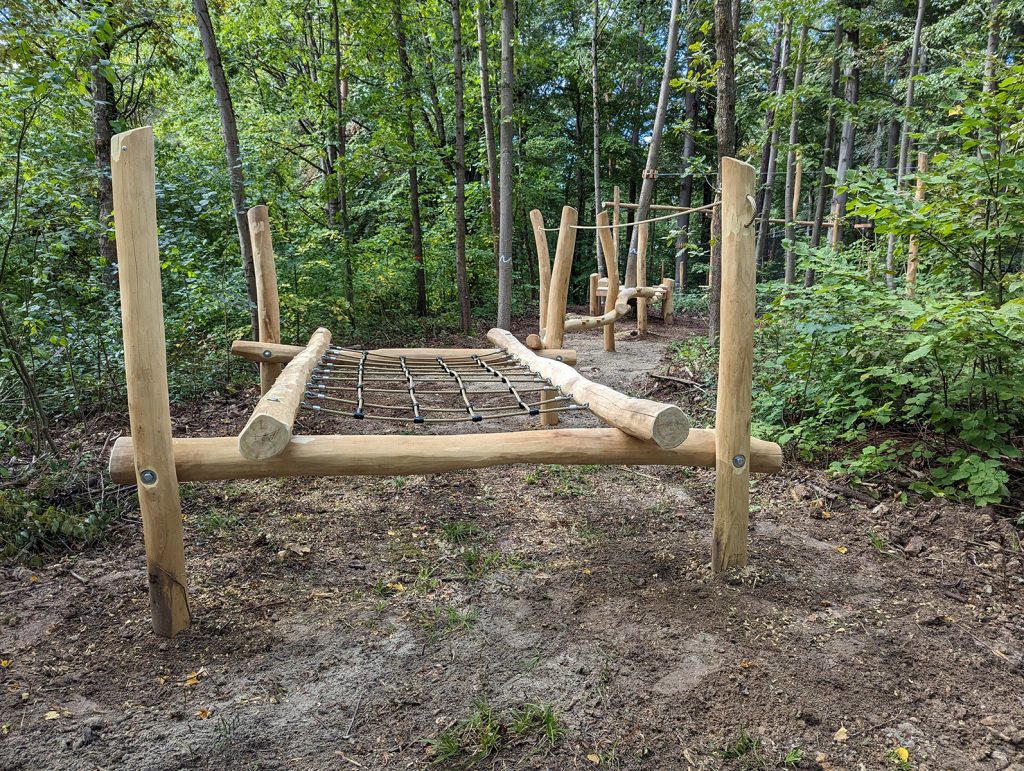 Mit einem Niedrigseilgarten – Hangel- und Kletterseile ergänzen den Parcours und regen zum kreativen Spielen an.