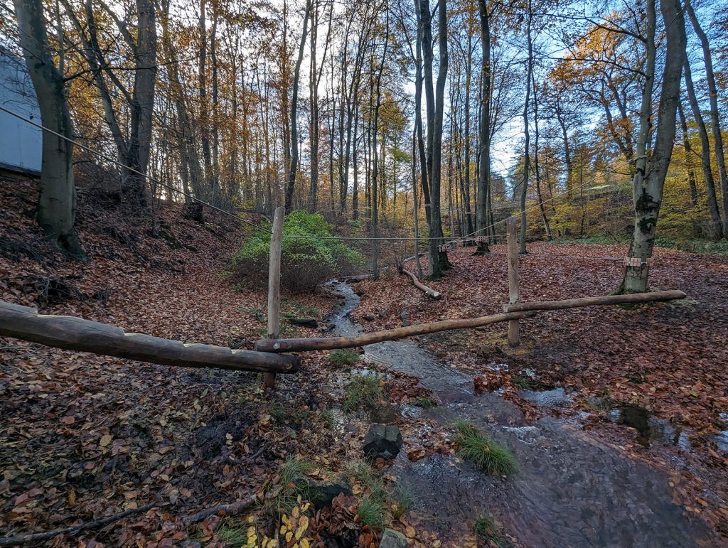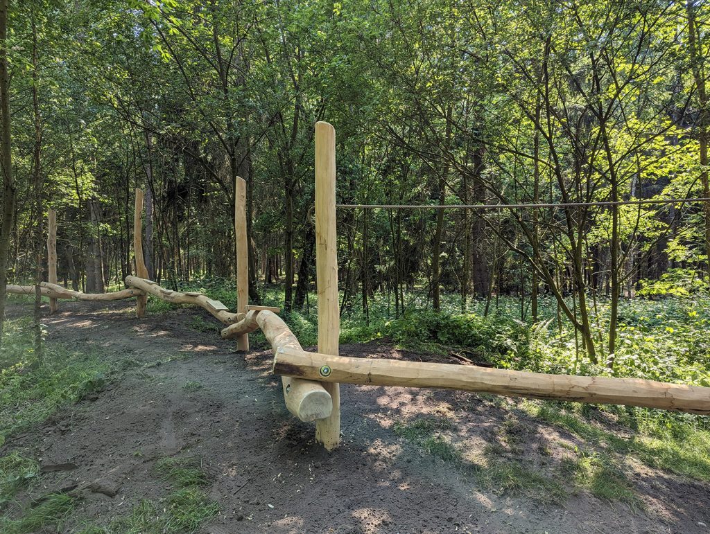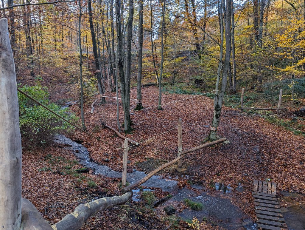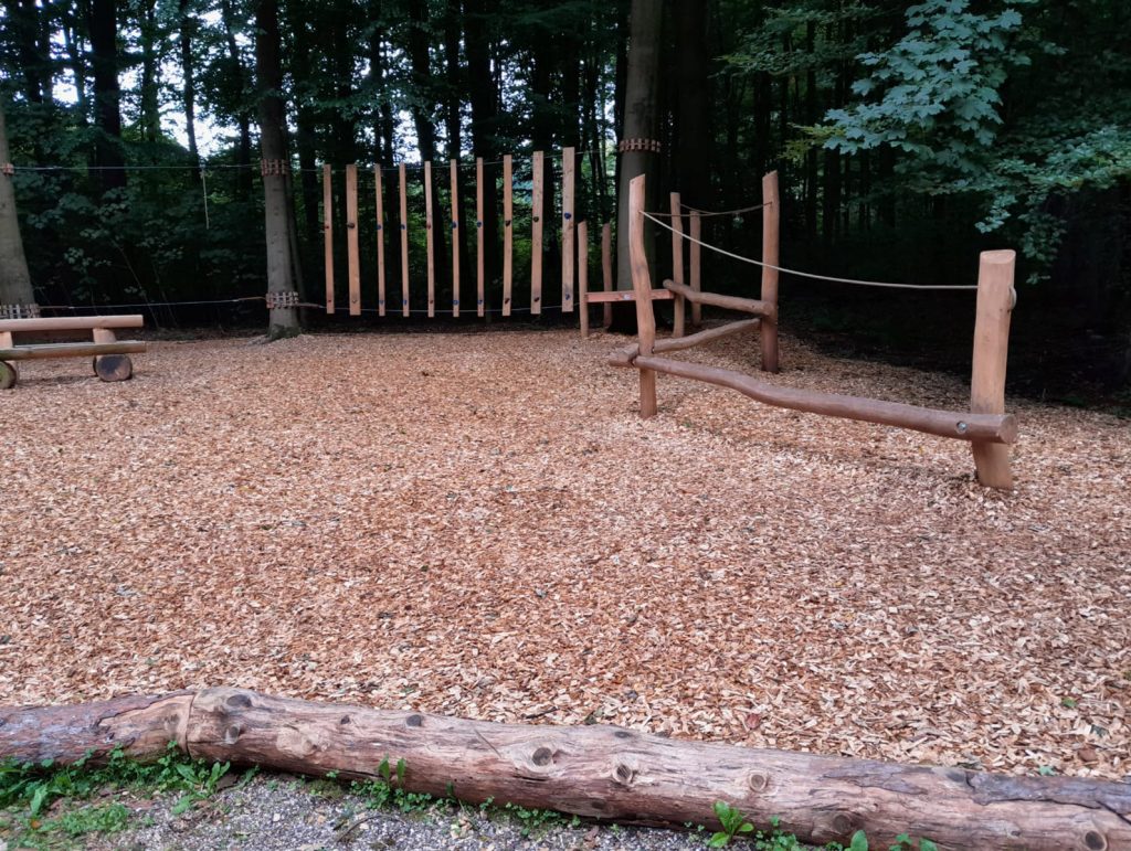 Mit einem Niedrigseilgarten – Hangel- und Kletterseile ergänzen den Parcours und regen zum kreativen Spielen an.