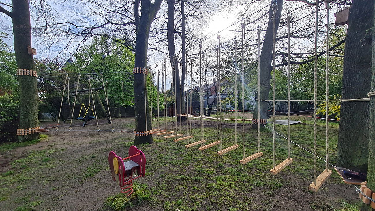 Für die Kita Urbanus in Dorsten haben wir einen Niedrigseilgarten zwischen alten Eichen realisiert. Die Anlage richtet sich an Kinder im Alter von 3 bis 6 Jahren und bietet vielfältige Aufgaben in unterschiedlichen Schwierigkeitsgraden.