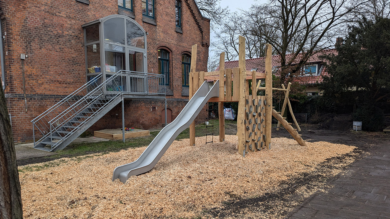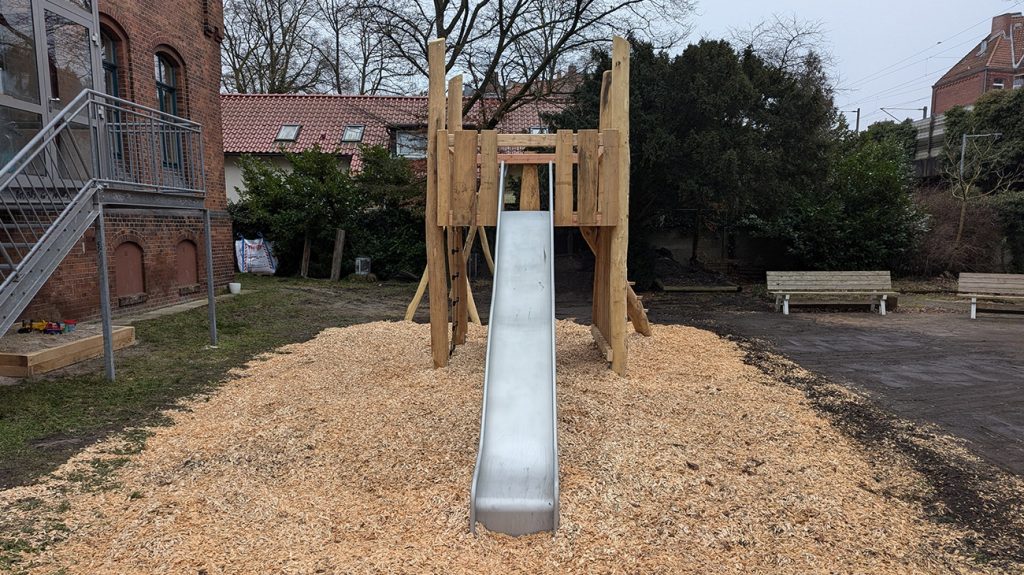 Unterhalb des Hauses bietet ein geschützter Bereich Raum zum Rückzug, während eine Rutsche als Highlight für Bewegung, Spaß und gemeinsame Erlebnisse sorgt. So entstand ein inklusiver Spielraum, der sowohl fördert als auch Freude schenkt.